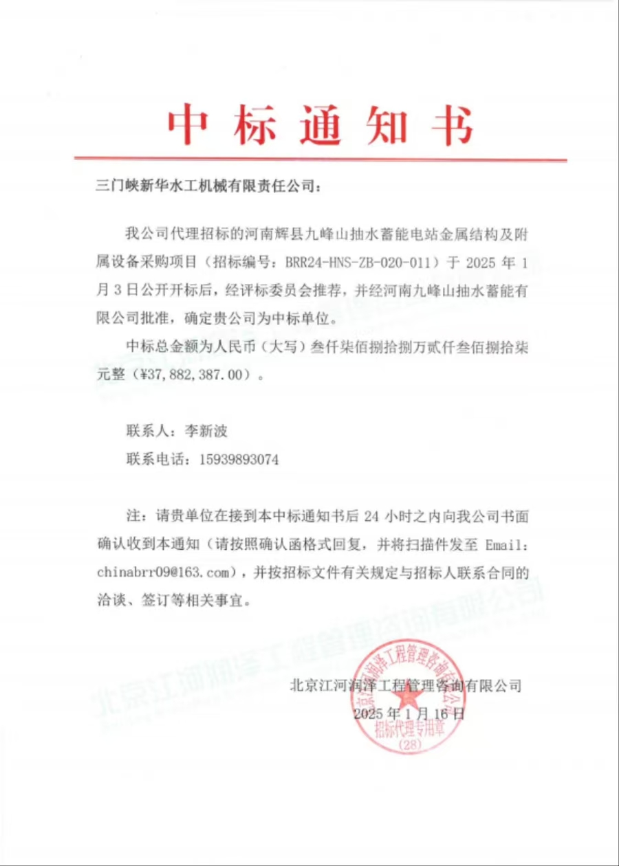2025年1月16日,公司經(jīng)營工作再傳喜訊,迎來新年開門紅,成功中標(biāo)河南輝縣九峰山抽水蓄能電站金屬結(jié)構(gòu)及附屬設(shè)備采購項(xiàng)目,合同金額3788萬元。